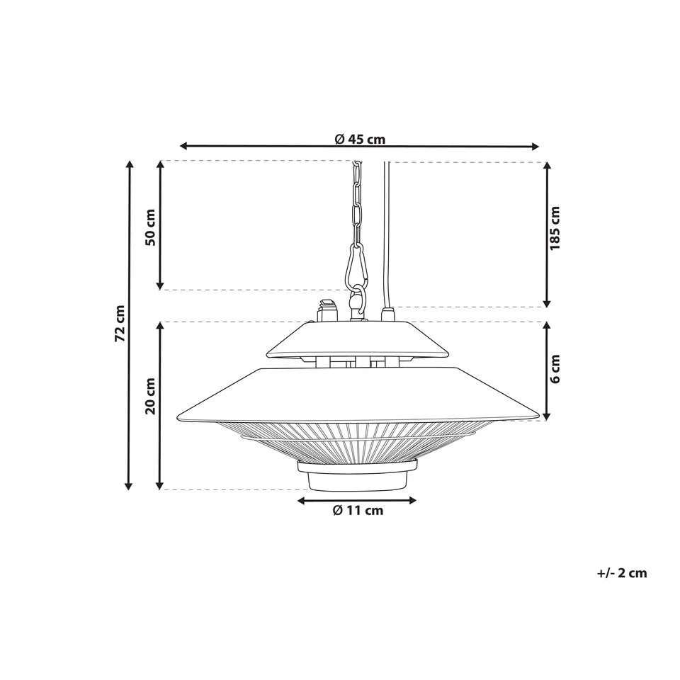 Infrarode Hangende Buitenverwarmer. Deze terrasverwarmer is de perfecte toevoeging aan jouw terras. Als je met vrienden bijeenkomt hoef je je niet meer druk te maken om lage temperaturen. Het monteren van de verwarmer is vrij simpel. Bevestig de haak aan het plafond of ergens anders buiten het bereik van kinderen en hang het toestel op. De afstandsbediening die met de verwarmer wordt meegeleverd, zet de terrasverwarmer makkelijk en veilig aan. Infraroodverwarming verspreidt de warmte geleidelijk en geeft het gevoel van de zon op je huid.