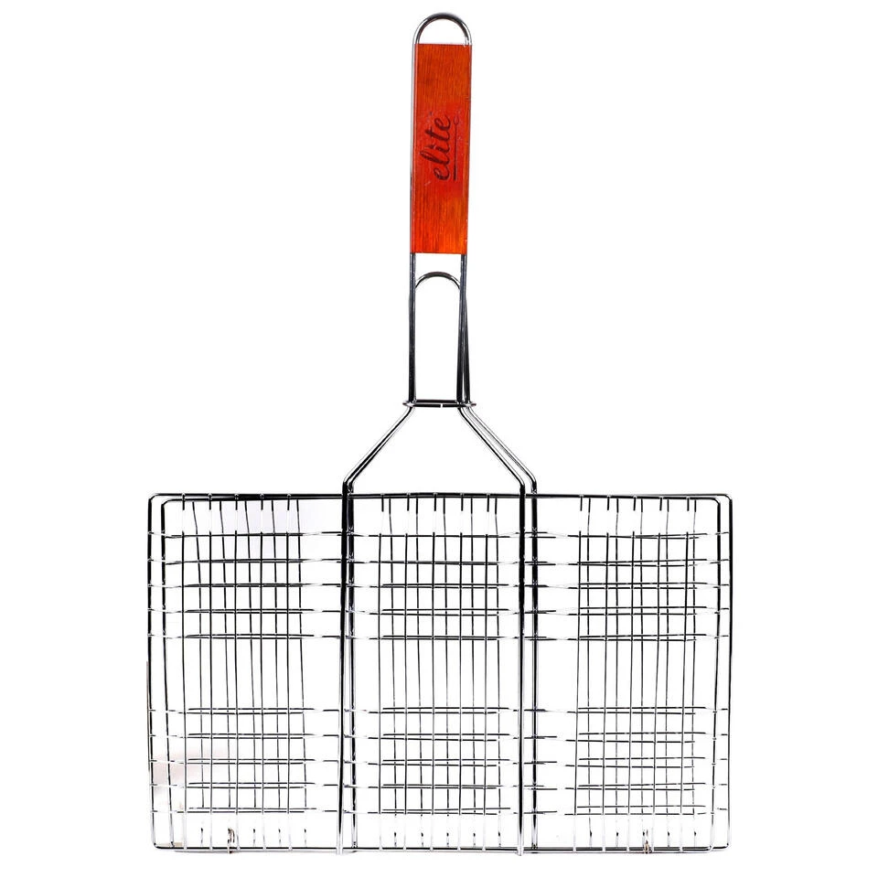 Elite BBQ/barbecue rooster of klem grill gemaakt van chrome metaal/hout met afmetingen 34 x 50 x 1 cm. Handig bbq gereedschap om vlees, groente of vis te grillen en gemakkelijk om te draaien zonder uw handen te verbranden. Geniet van uw maaltijd.