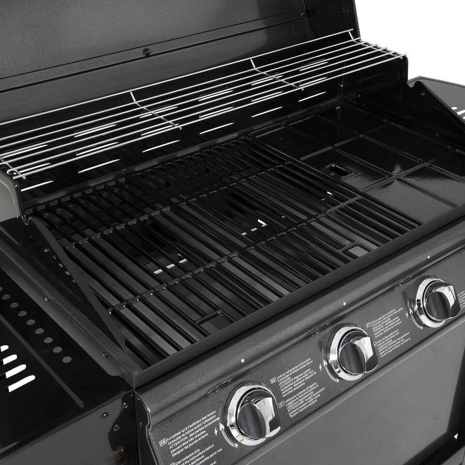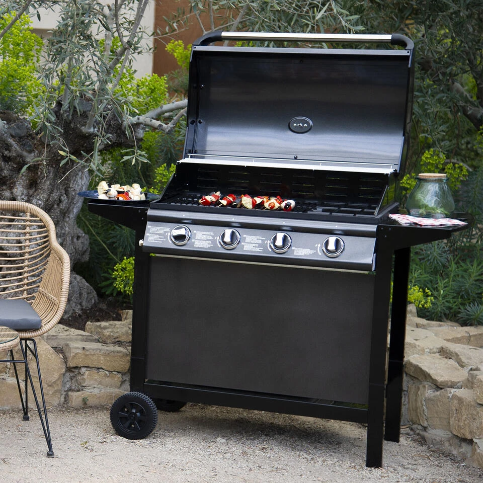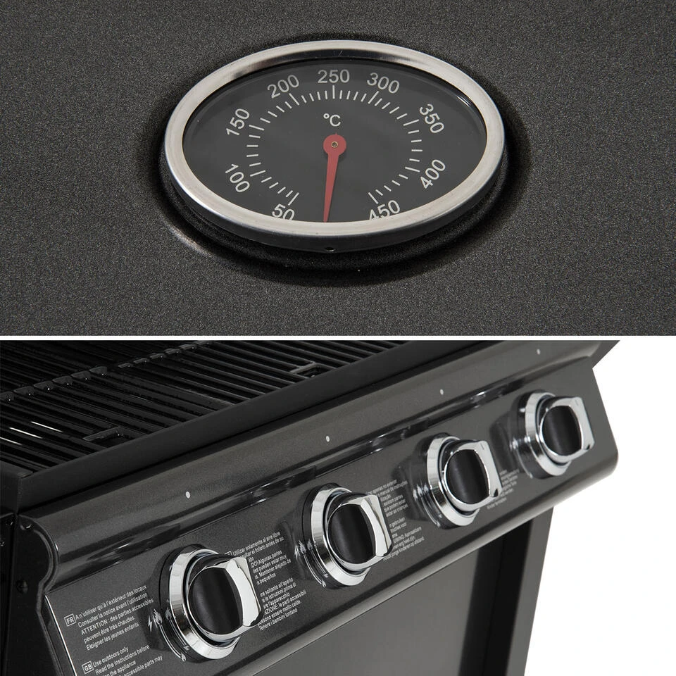 Met deze gasbarbecue geniet u van heerlijke en gezonde zomerse gerechten in uw tuinkamer! Grillliefhebbers zullen een nieuwe manier ontdekken om te koken en van hun eten te genieten. U kunt kiezen tussen de 2 grills of de plancha om uw eten te bereiden. Deze barbecue heeft alles om de zondagse chef te plezieren. U hoeft niet lang te wachten om te beginnen koken dankzij de piëzo-ontsteking die in de 4 branders is geïntegreerd. Er zit zelfs een thermometer op het deksel om de warmte onder controle te houden. Deze 4-pits barbecue blijft zeer functioneel met zijn 2 zijplanken en zijn lage plateau, ideaal voor het opbergen van de gasfles en het keukengerei.